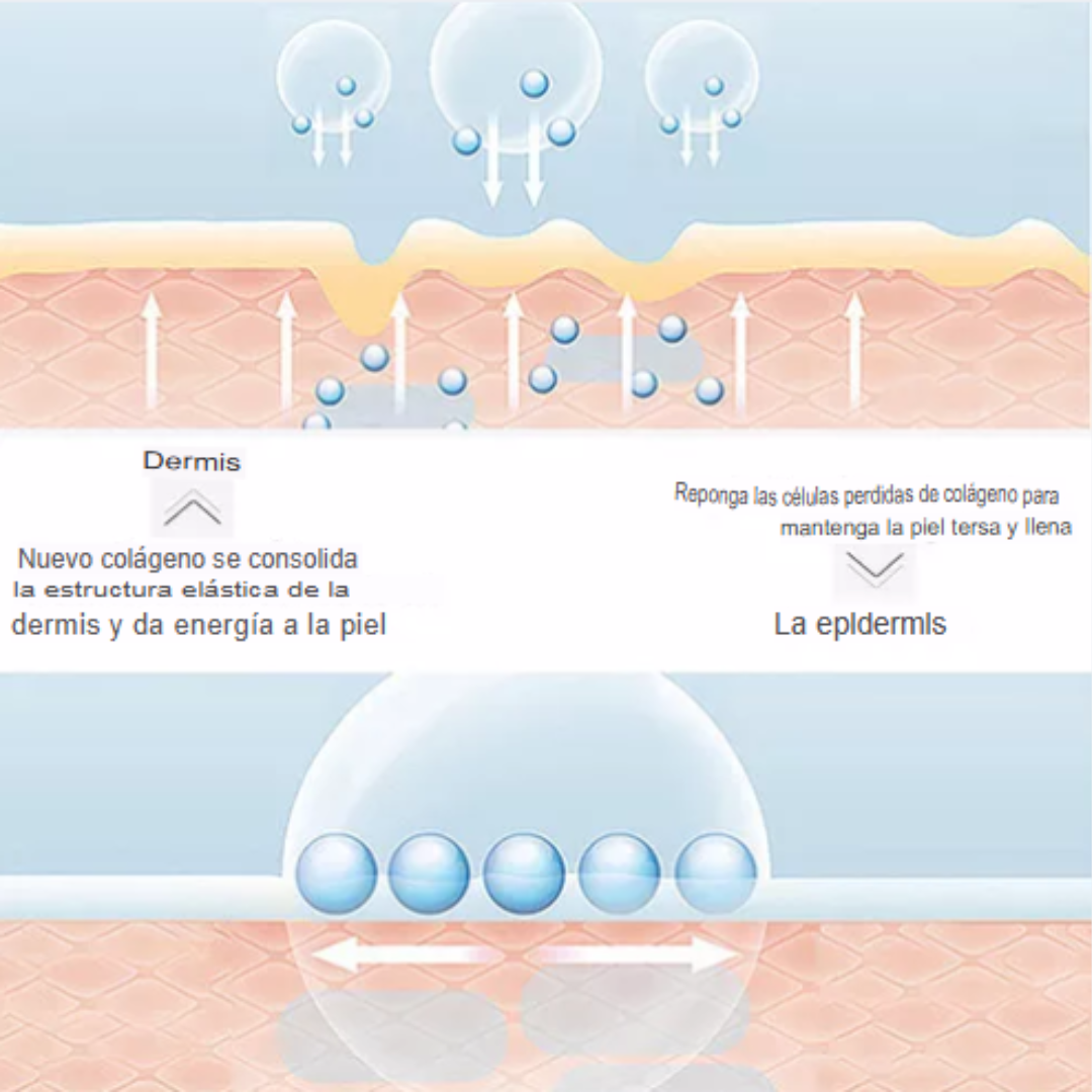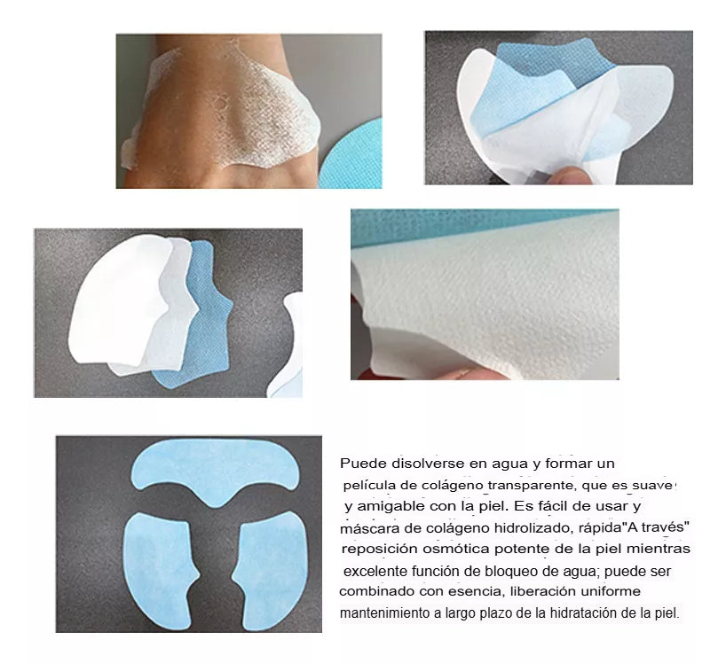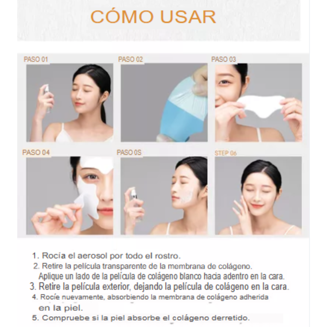 Gracias a esta tecnología, la película de colágeno es 100% soluble, por lo que se disuelve maravillosamente en la piel. Al rociar la niebla sobre la película, la esencia de colágeno patentada se disuelve por completo, da hidratación, plenitud, elasticidad y luminosidad a la piel, la revitaliza.
