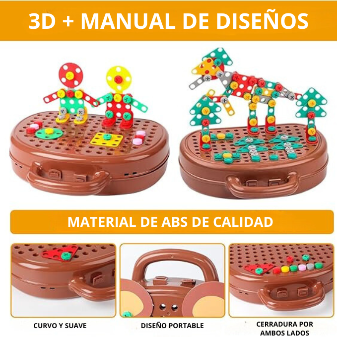 El juego incluye una variedad de herramientas, como un taladro eléctrico, tornillos y bloques de construcción, que permiten a los niños ensamblar y desarmar diferentes estructuras.
