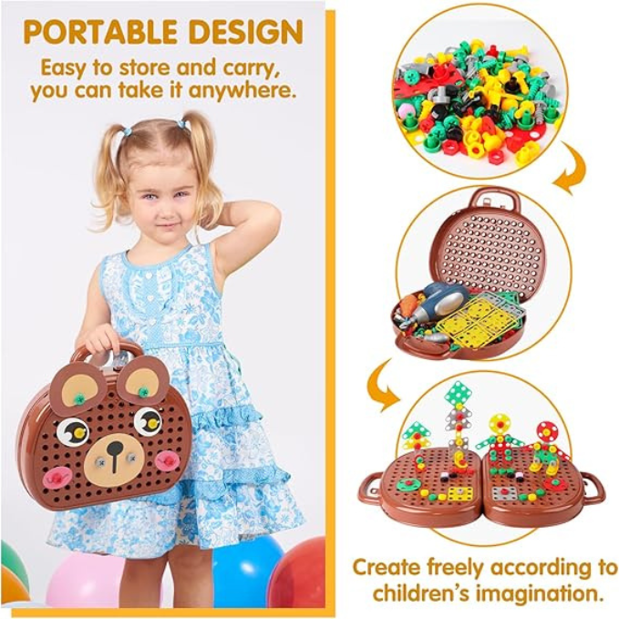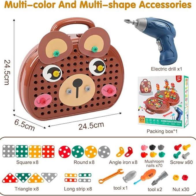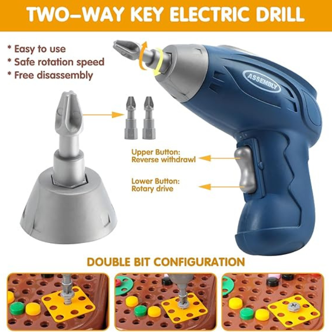 El juego de herramientas con taladro eléctrico para niños es un regalo ideal para jóvenes constructores e ingenieros en ciernes. El taladro eléctrico es fácil de manejar y funciona con controles simples y aptos para niños.